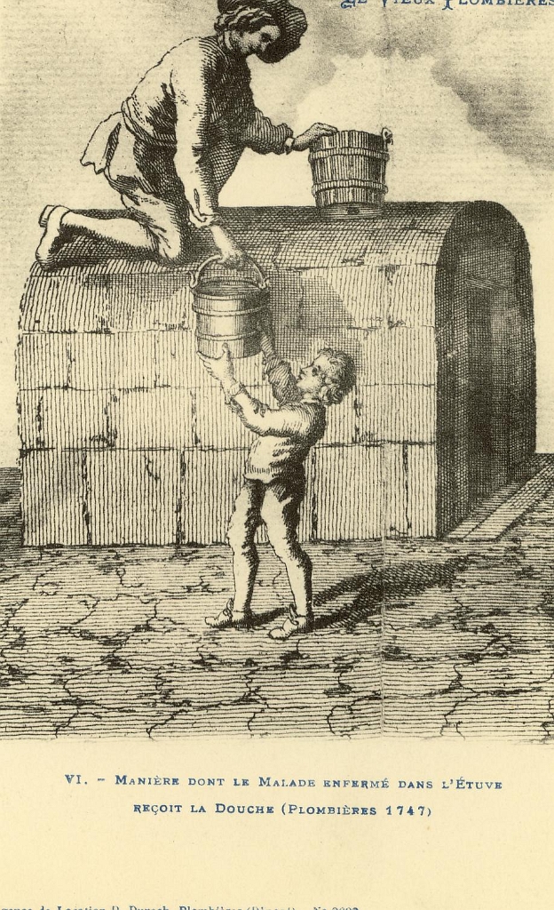 Le Vieux Plombières. - 6. - Manière dont le Malade enfermé dans l'Etuve reçoit la Douche (Plombières 1747)
